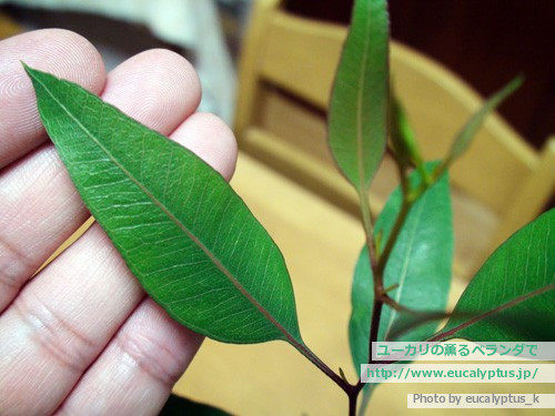 先の尖った、典型的なユーカリの葉形をしています。